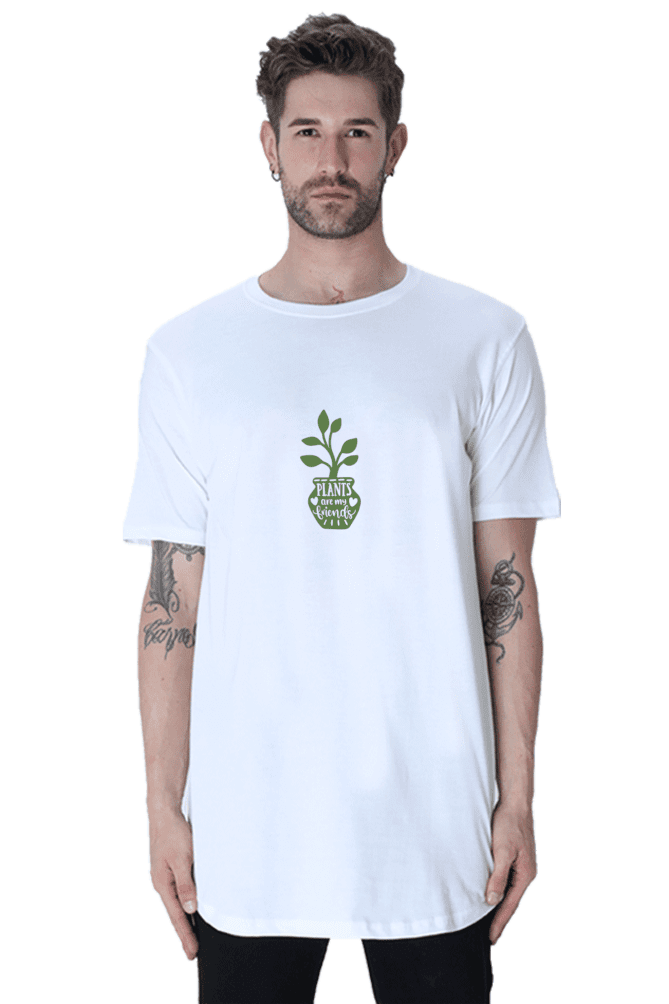 Celebrate Your Love for Nature with VIBHAN’s Green Life Male Longline Curved T-Shirt – “Plants are my friends”