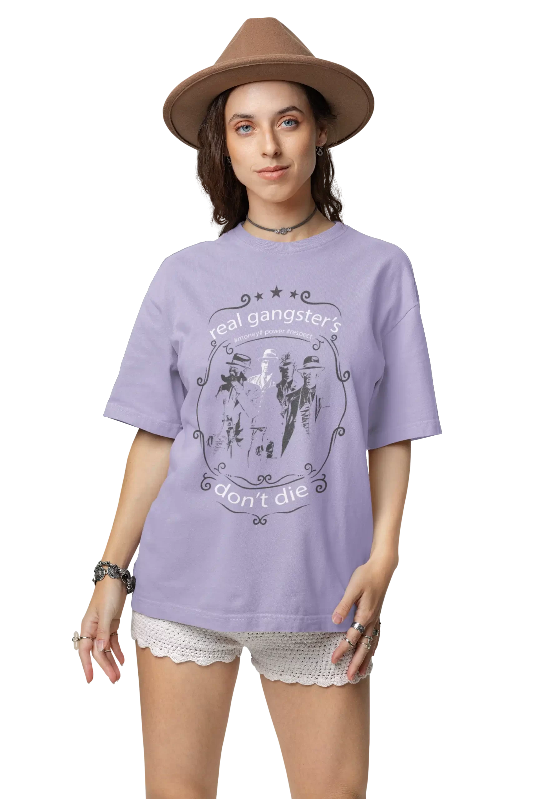 - Bold “Real Gangster” Graphic: Embrace your inner strength with the powerful “Real Gangster” message, making a statement in every outfit.