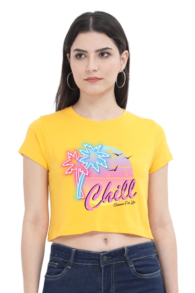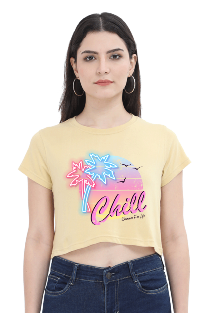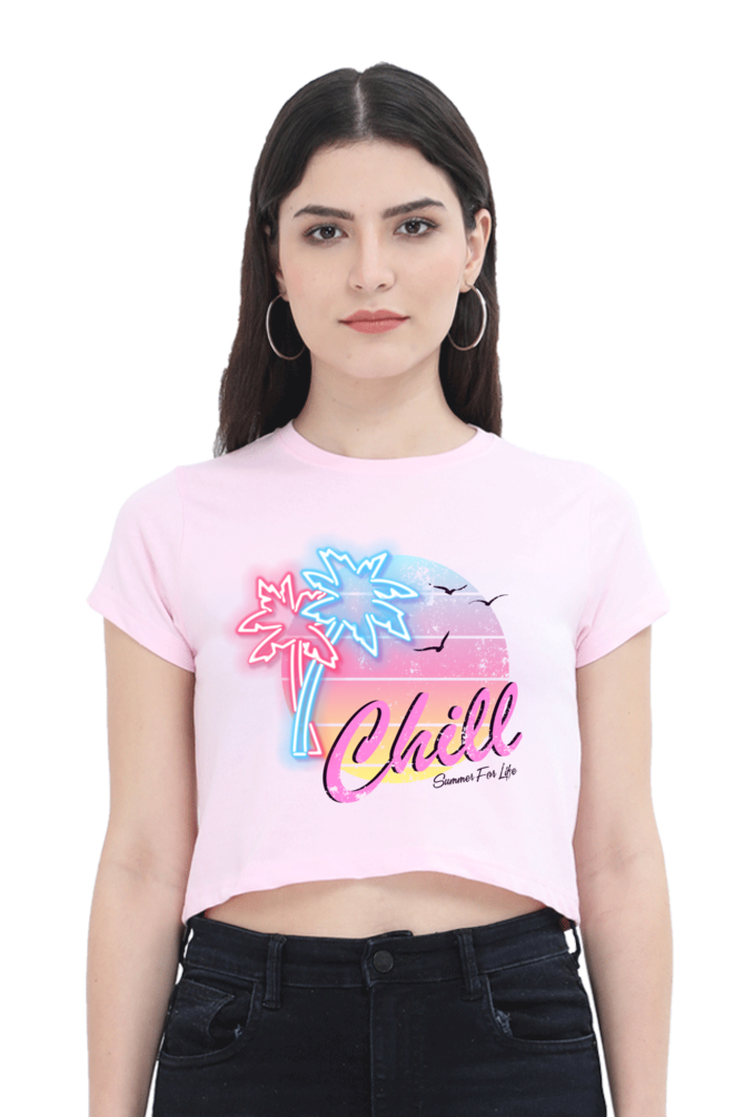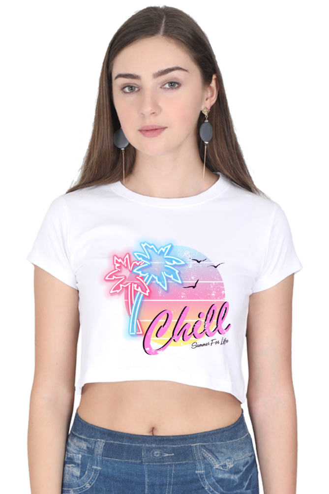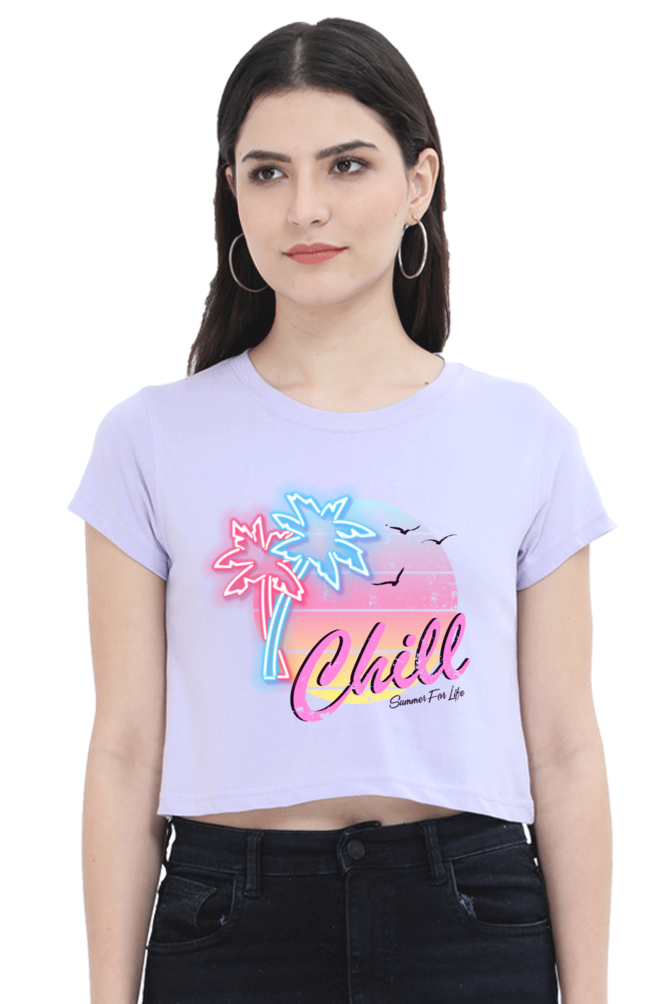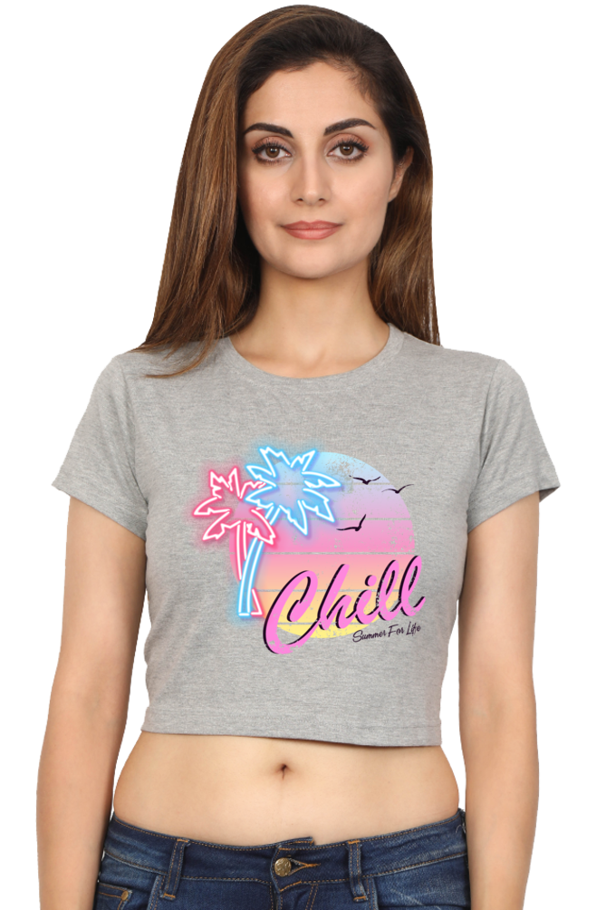 - Stylish crop top with a relaxed “Chill” design