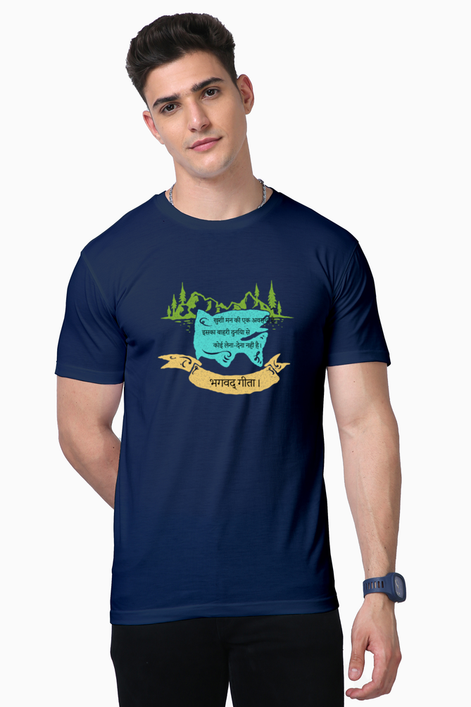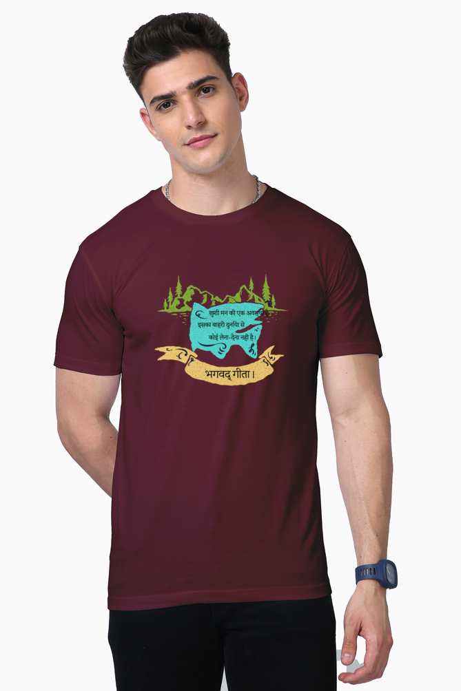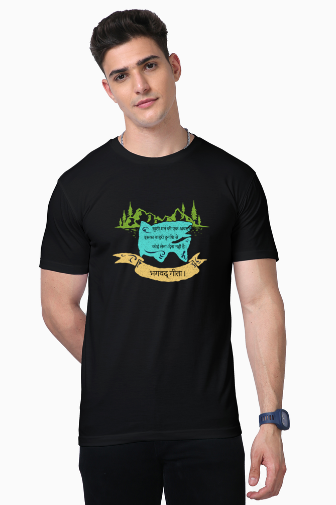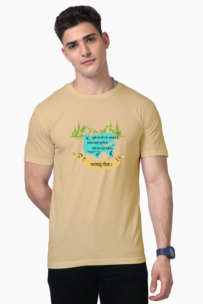 The unisex style is versatile and fits all body types comfortably, making it an essential addition to any wardrobe. The Lycra ribbed neck adds just the right amount of stretch, ensuring that the neckline retains its shape over time. Whether you’re meditating, practicing yoga, or simply enjoying a peaceful day, this t-shirt serves as a gentle reminder of the teachings of the Bhagwat Gita – happiness lies within.